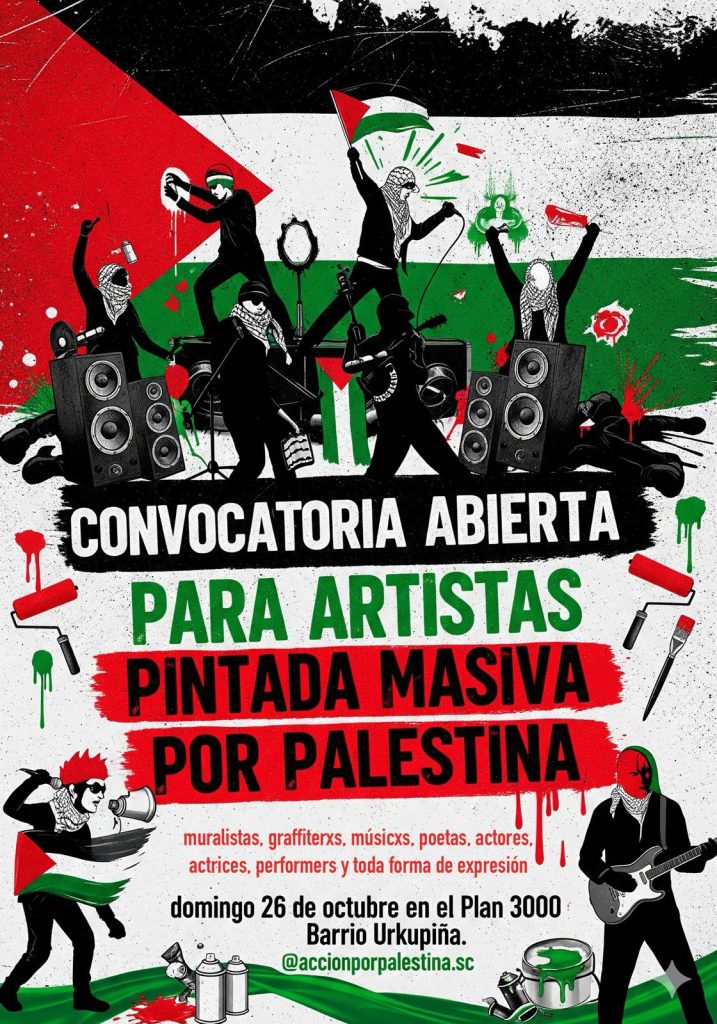 Desde Acción por Palestina – Personas movilizadas de Santa Cruz afirman que esta iniciativa busca articular la creación artística con la acción solidaria, recordando que “cuando un pueblo es oprimido, todos los pueblos libres deben alzar la voz”.